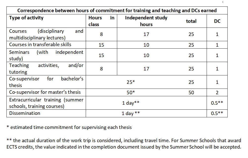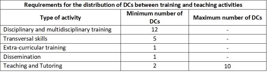 DCs quantify the workload required to fulfil the doctoral requirements: For research activities each DC represents 25 hours of work. For training and teaching activities, the details are on table "Correspondence between hours of commitment for training and teaching and DCs earned".