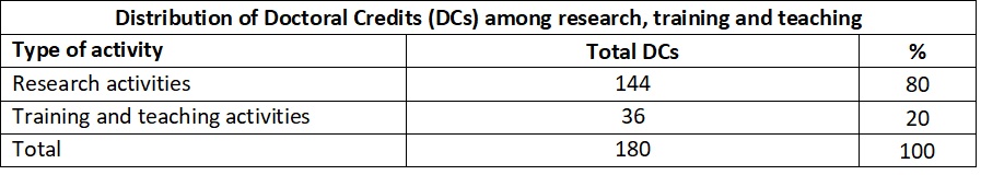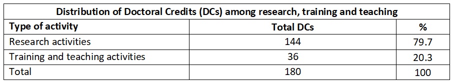 Throughout the three-year PhD program, each student must complete a total of 180 Doctoral Credits (DCs), distributed among Research activities and Training and teaching activities.
