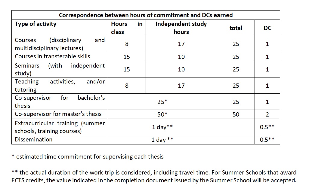 Throughout the thee-year PhD career, each student will have to allocate 180 Doctoral credits (DCs) across research activities, training and teaching courses. The DCs measure the workload required of a Ph.D. student for these activities to complete their doctoral degree. Ph.D. students must earn at least 60 DCs each year, equating to 1,500 hours of activity, with each DC representing 25 hours of commitment. For training and teaching activities, one DC is equivalent to one credit in the European Credit Transfer System (ECTS).