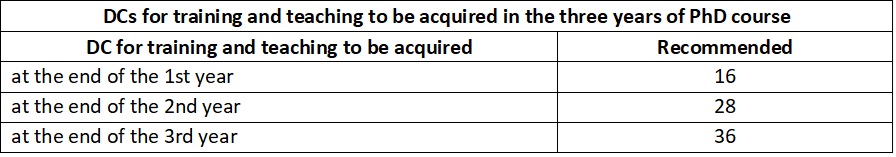 The program recommends a yearly number of Doctoral Credits (DCs) that PhD students should earn through training and teaching activities to maintain a balanced workload alongside their research. If a student does not reach the recommended annual number of DCs, the shortfall may be carried over to the following year.