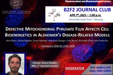 Nicola Rizzardi, a 1st-year PhD student, will present the data and results from the work entitled "Defective Mitochondrial Pyruvate Flux Affects Cell Bioenergetics in Alzheimer’s Disease-Related Models" published on Cell Reports 2020 30, 2332 2348.