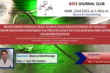 The 1st year PhD student Bianca Martinengo will discuss the results from the research article titled “Monoamine Oxidase (MAO-N) Biocatalyzed Synthesis of Indoles from Indolines Prepared via Photocatalytic Cyclization/Arylative Dearomatization”. Moderator: Irene Brusa.