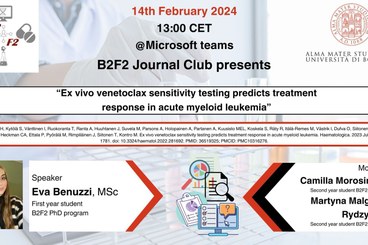 The 1st year PhD student Eva Benuzzi will discuss the article "Ex vivo venetoclax sensitivity testing predicts treatment response in acute myeloid leukemia" (Kuusanmäki et al., Haematologica, 2023). Moderators: Camilla Morosini, Martyna Malgorzata Rydzyk.